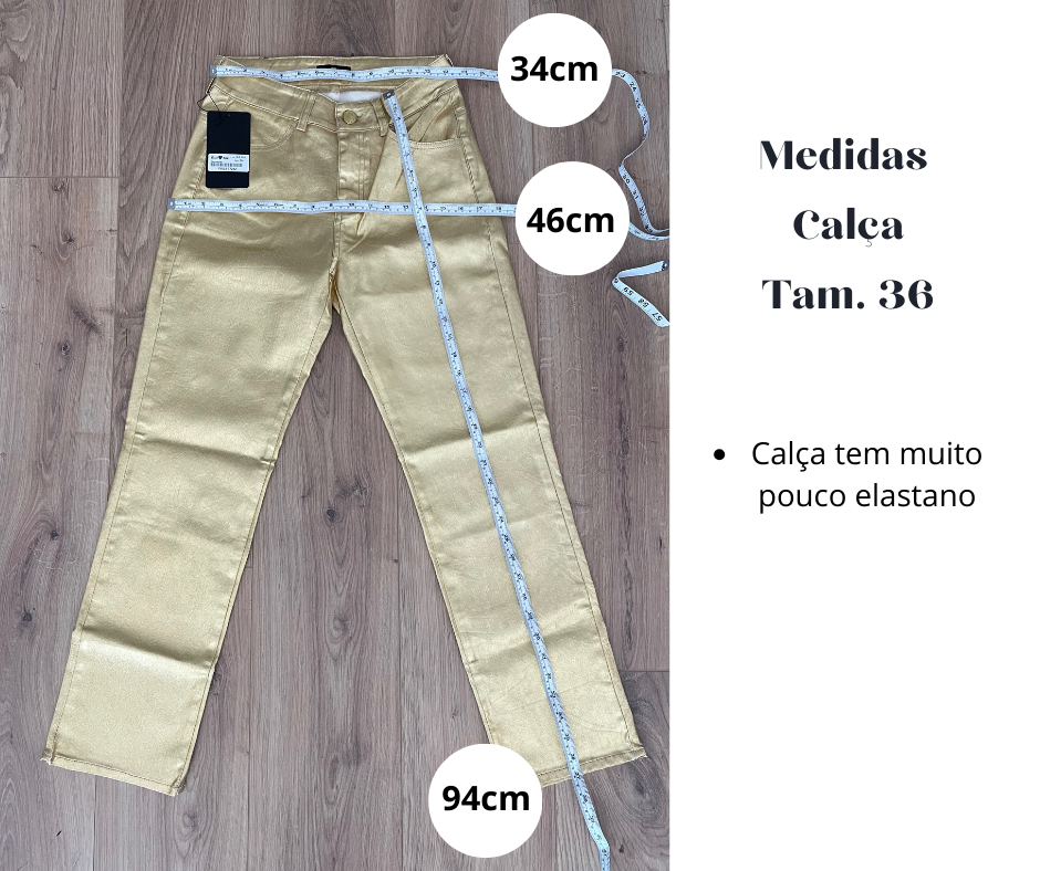 - Detalhes: Calça dourada metalizada. Fivelas para cinto. Justas. Cinta média/alta.
