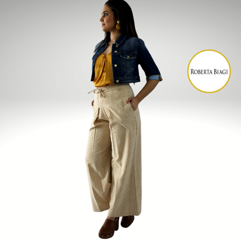 Mulher com casaco azul de ganga, blusa mostarda e calças largas bege com padrão geométrico, sapatos castanhos, fundo branco com logo ROBERTA BIAGI.