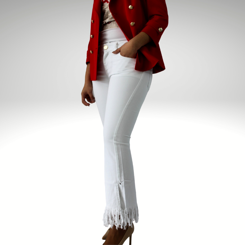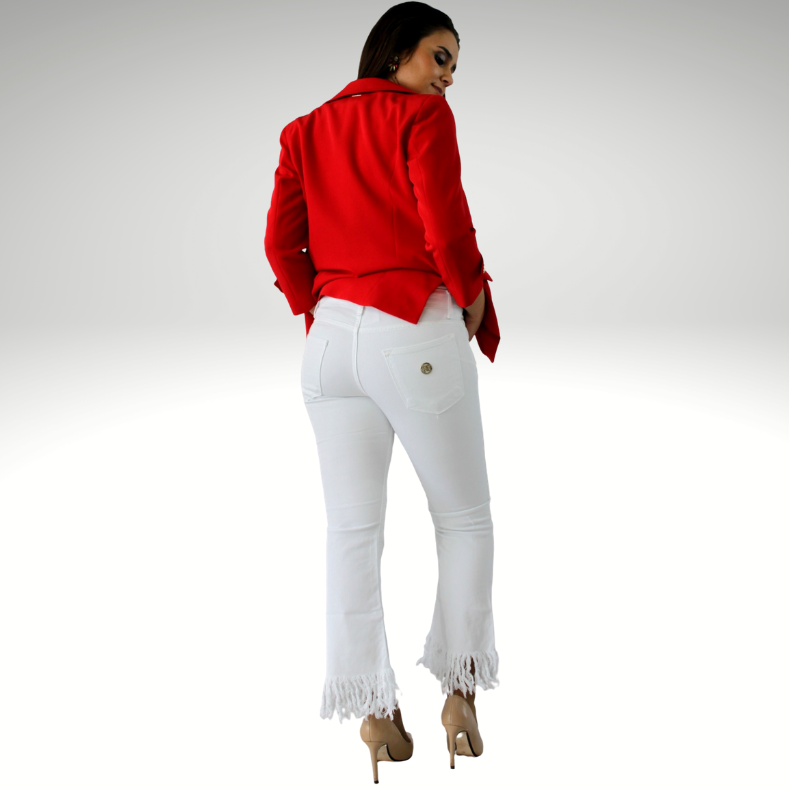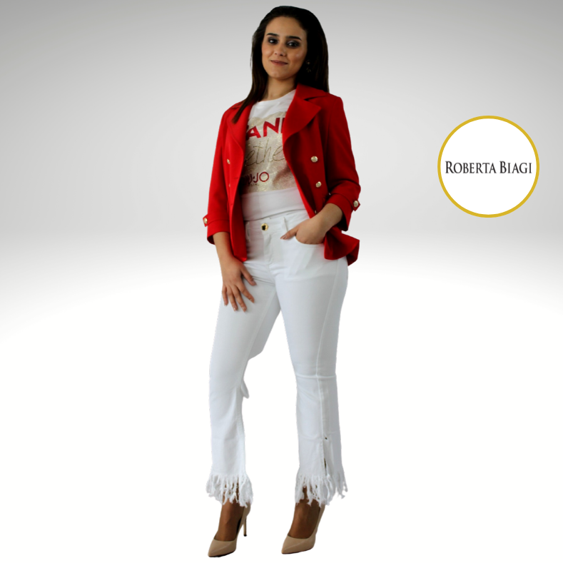 Mulher com blazer vermelho, t-shirt branca, calças brancas com franjas e sapatos bejes