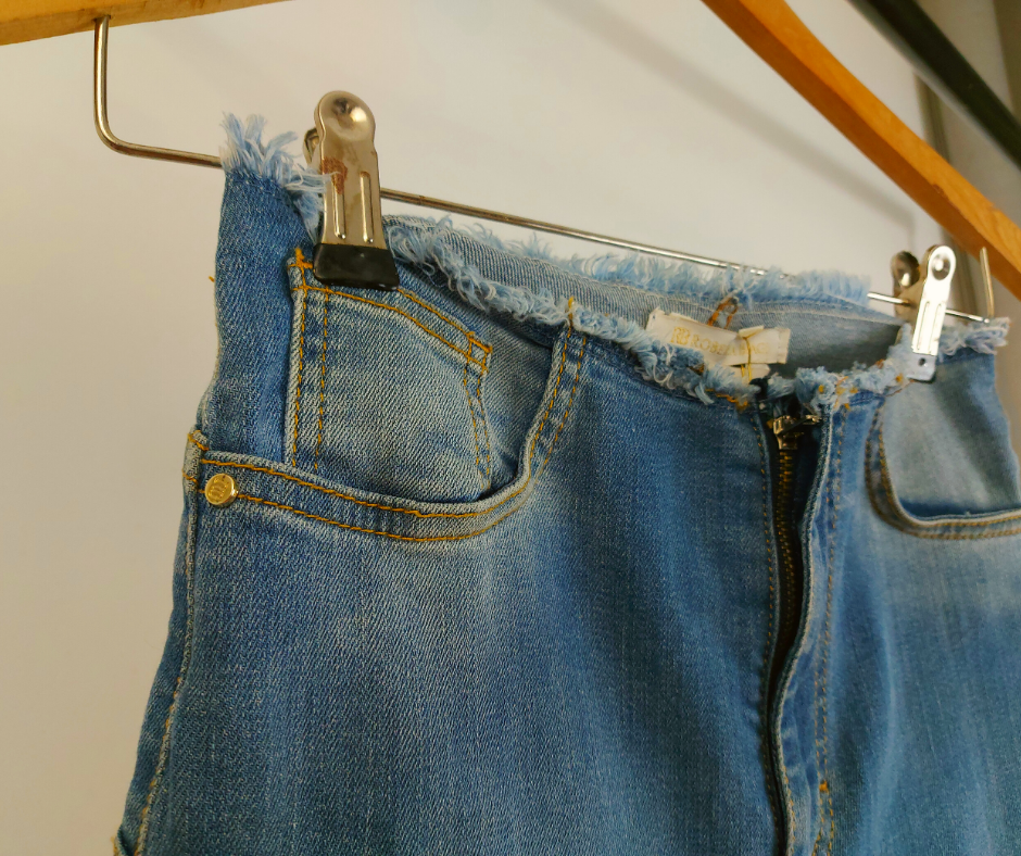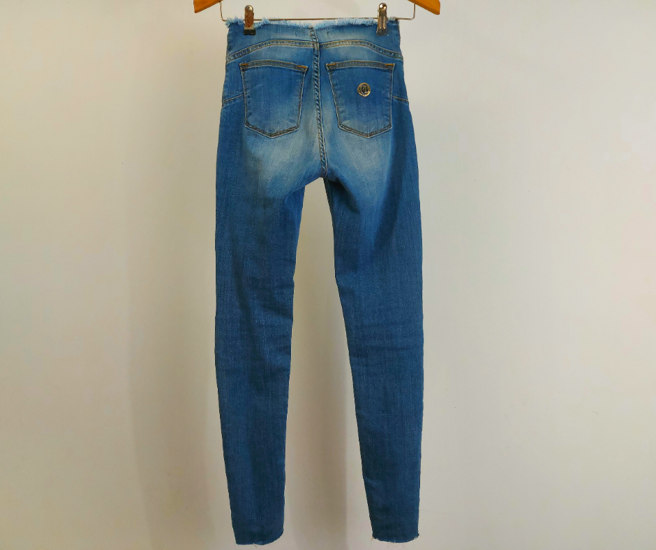 • Outros detalhes: Logotipo em dourado, bolso traseiro. Cintura e bainha, desfiados.