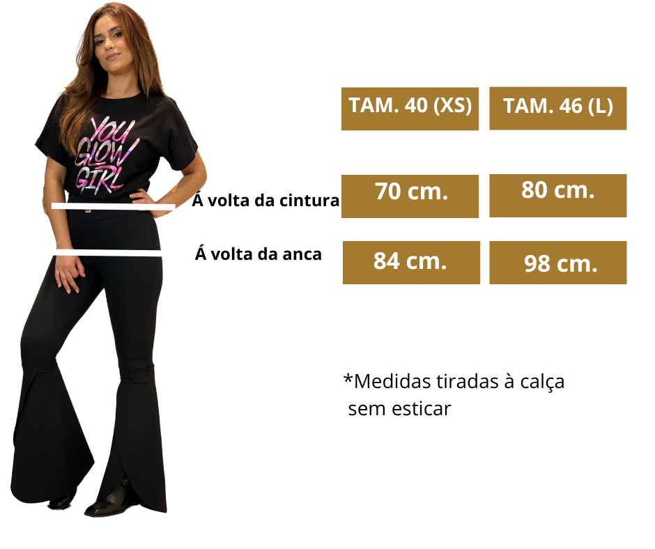 - Detalhes: Logótipo em dourado frontal, zona da barriga. Calça boca de sino, efeito aberto.