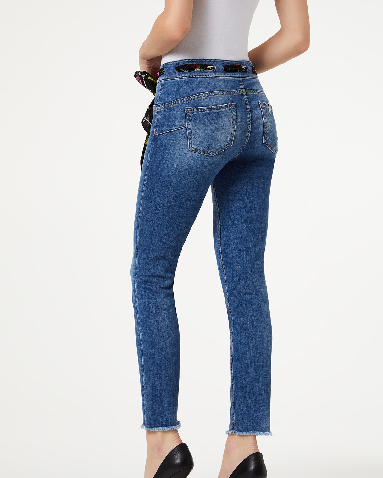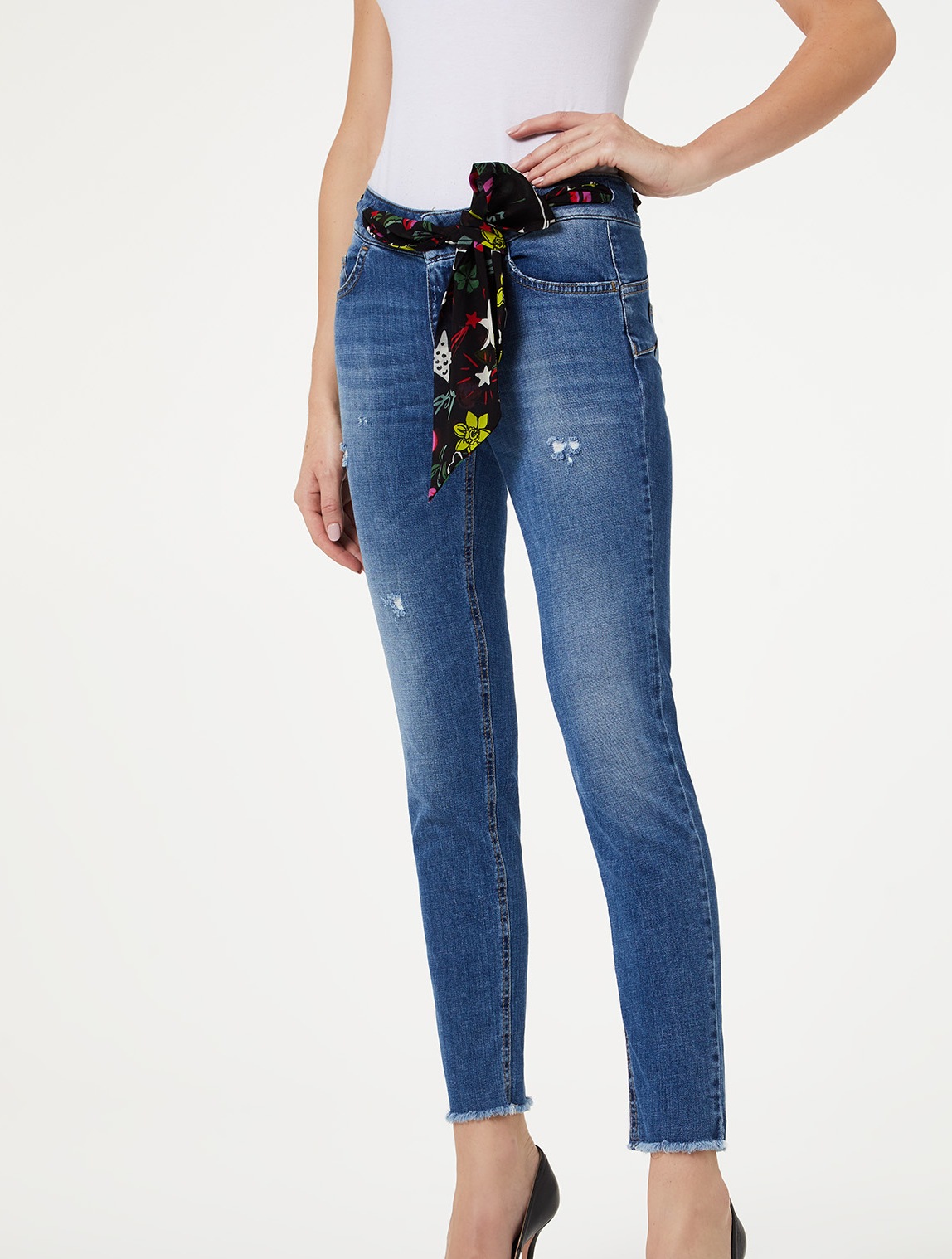 Calças de ganga azuis justas com cinto de tecido estampado preto e salto alto preto