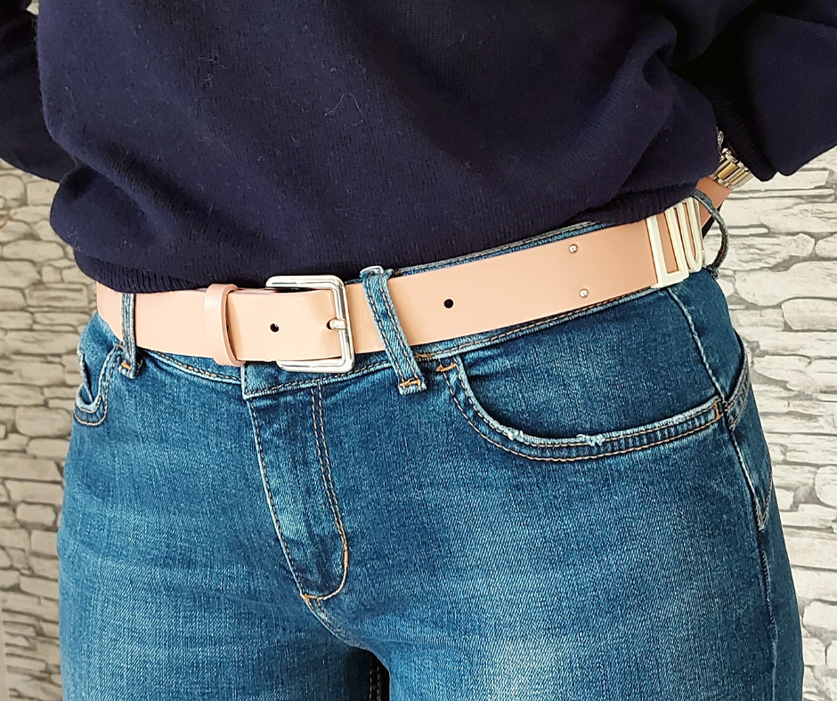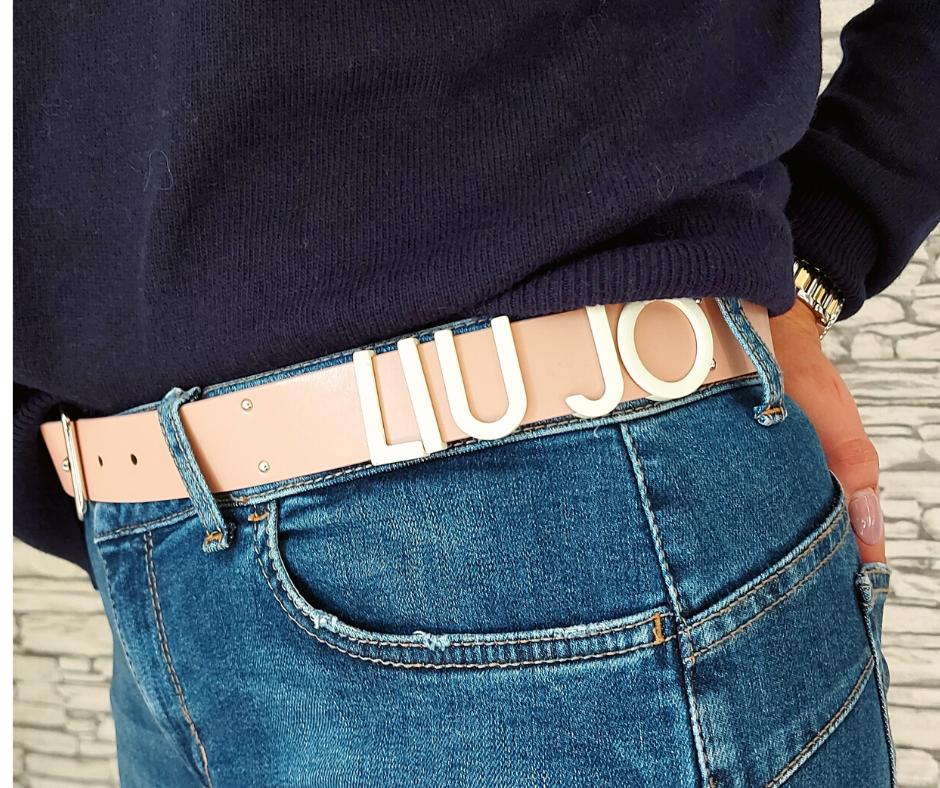 Cinto rosa claro de pele com letras douradas LIU JO usado com calças de ganga