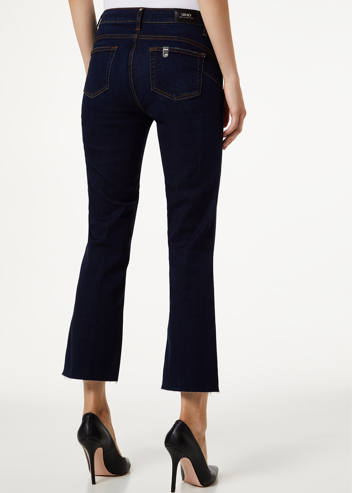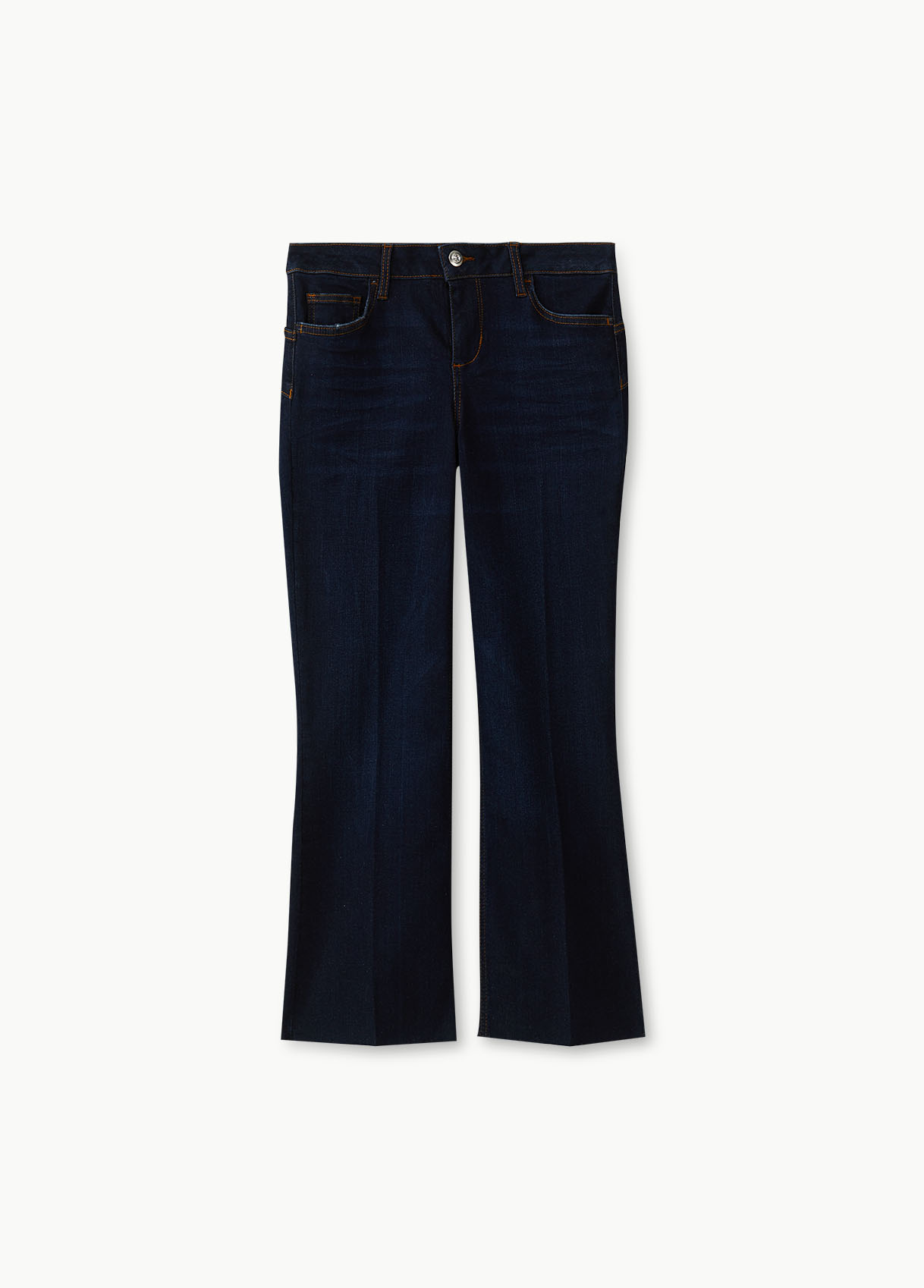 • Detalhes: Calça de ganga de lavagem escura. Modelo curto e baiinha desfiada. Costuras castanhas. Cintura média/alta.