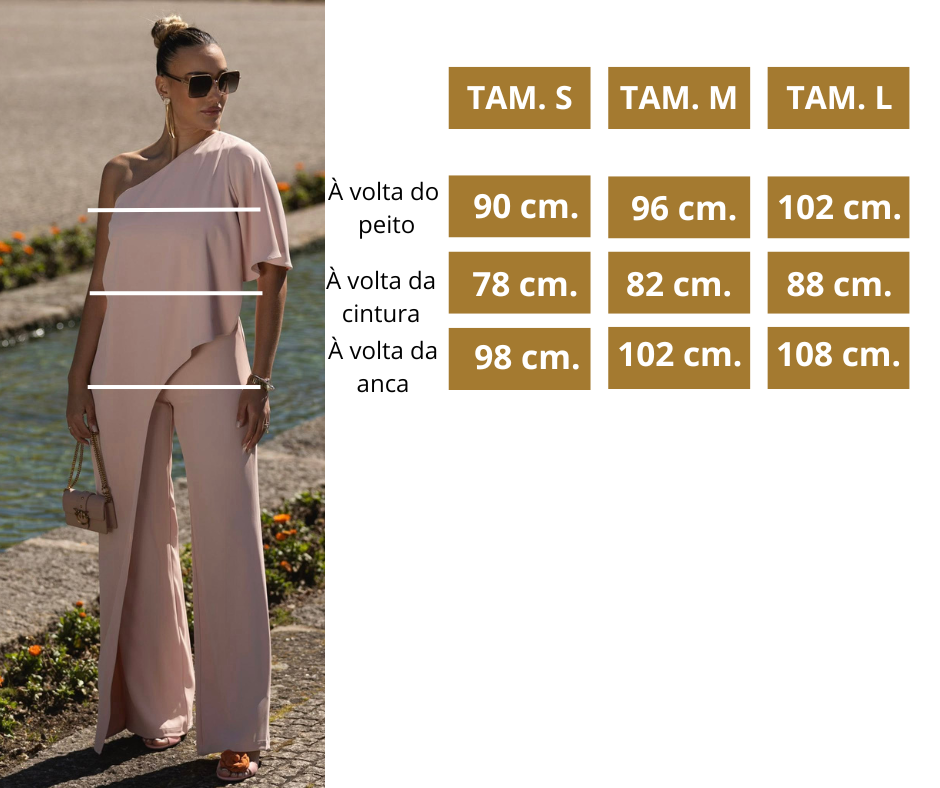 - Detalhes: Macacão com folho. Modelo assimétrico. Perna larga.