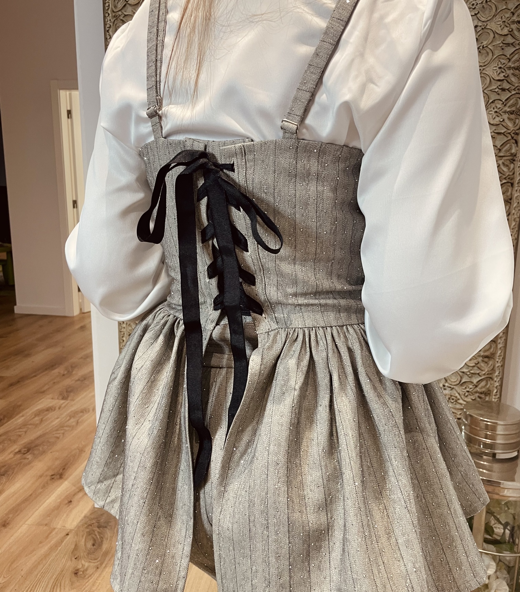 - Fecho: Aperta com zíper na lateral e com cordão na parte de trás.