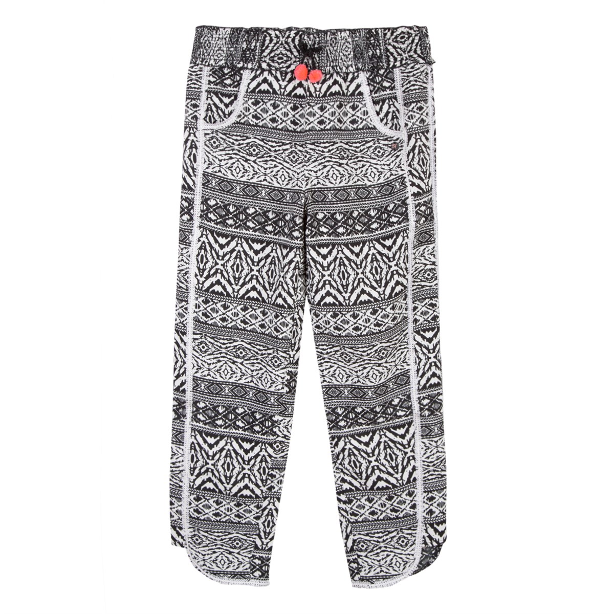 Calças pretas e brancas com padrão geométrico e cós elástico com cordões coloridos
