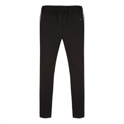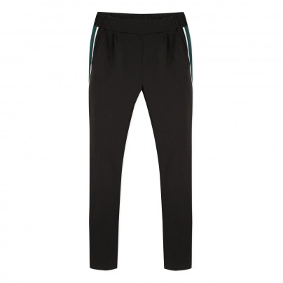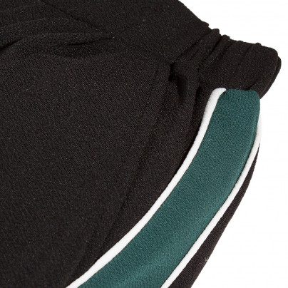 Calças desportivas pretas com riscas azuis e brancas nos bolsos