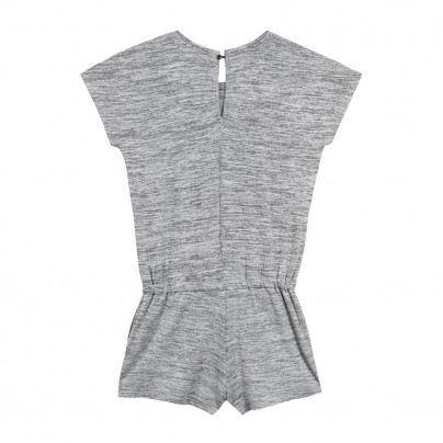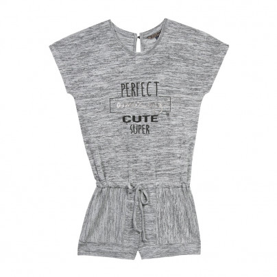 Macacão cinza claro curto com texto impresso e cordão na cintura.