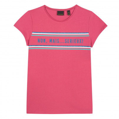 • Detalhes: T-shirt rosa com a descrição "não, mas ... sério!" em lantejoulas azuis reforçadas com listras brancas e verde pastel.