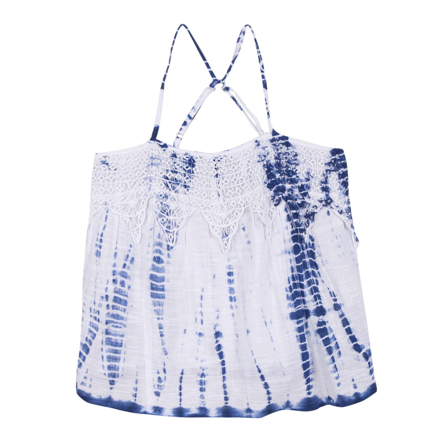 Blusa feminina branca com padrão tie-dye azul e renda, alças cruzadas