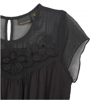 • Detalhes: Vestido plissado e transparente ma zona das mangas e peito. A zona do peito é embelezado com bordados e miçangas. BECKARO é costurado na cintura. Cintura elástica.