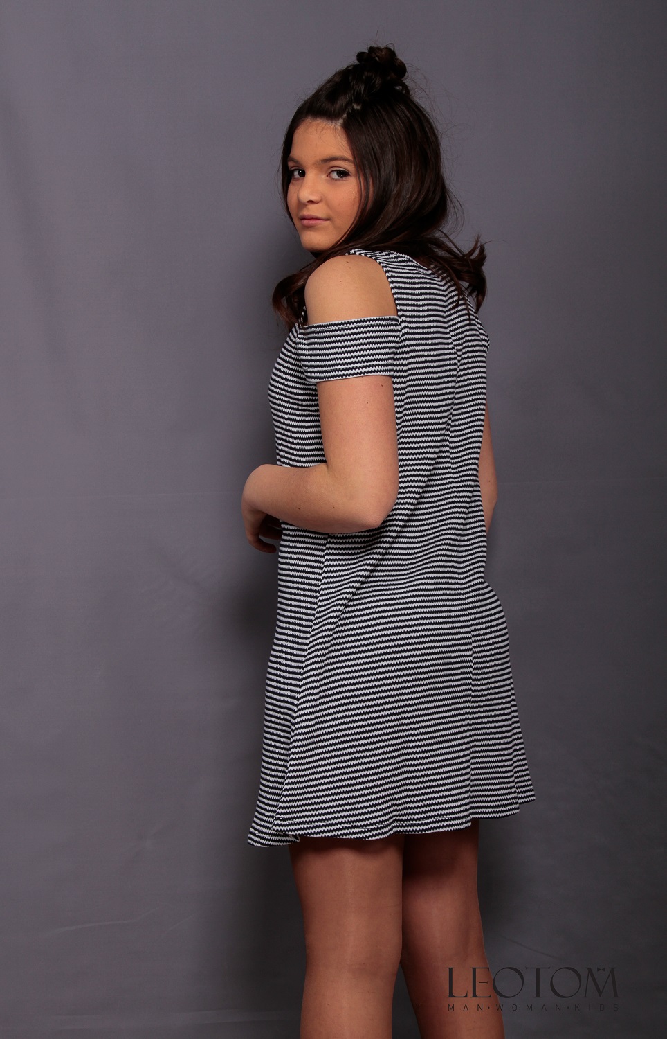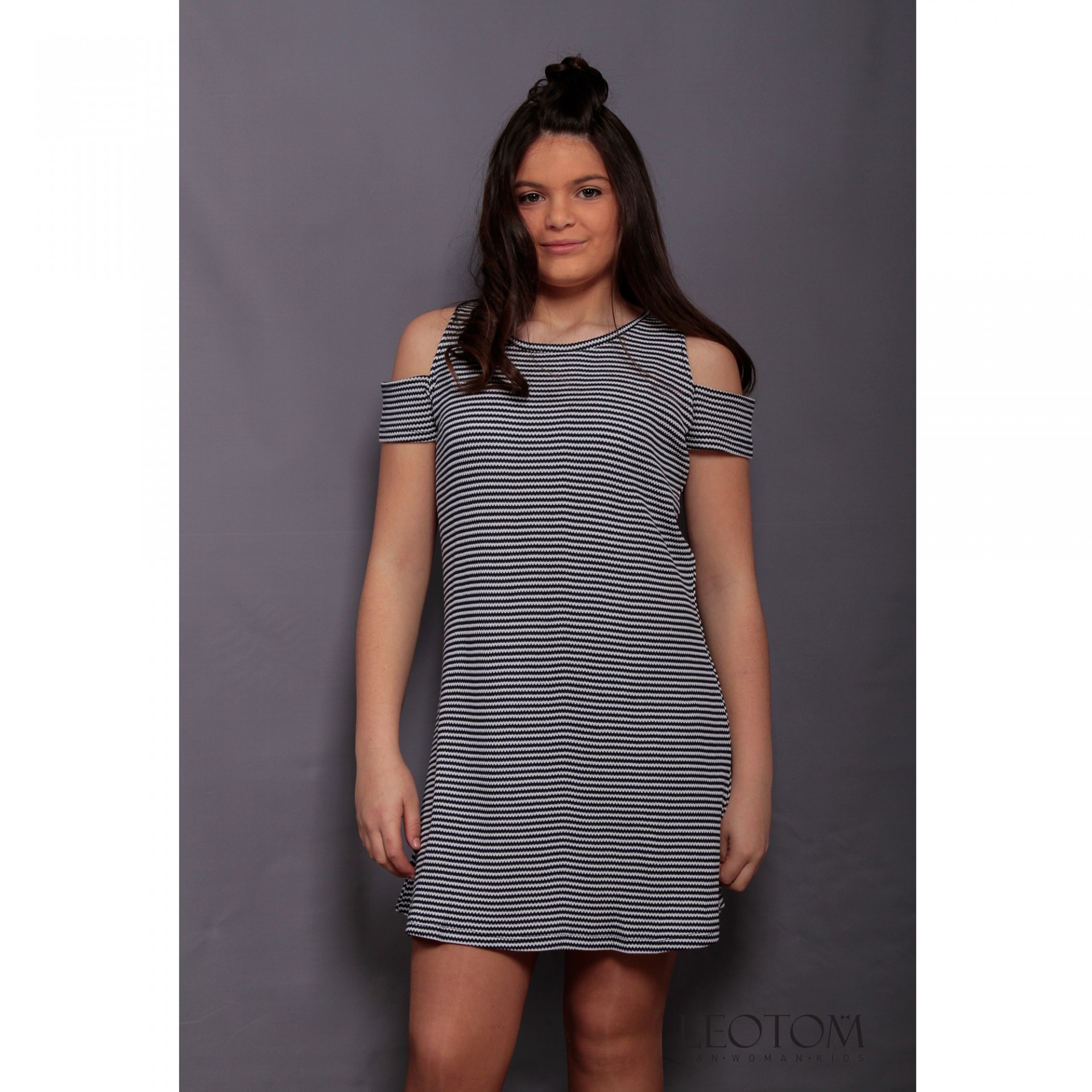 Vestido curto cinza com listras pretas com ombros descobertos