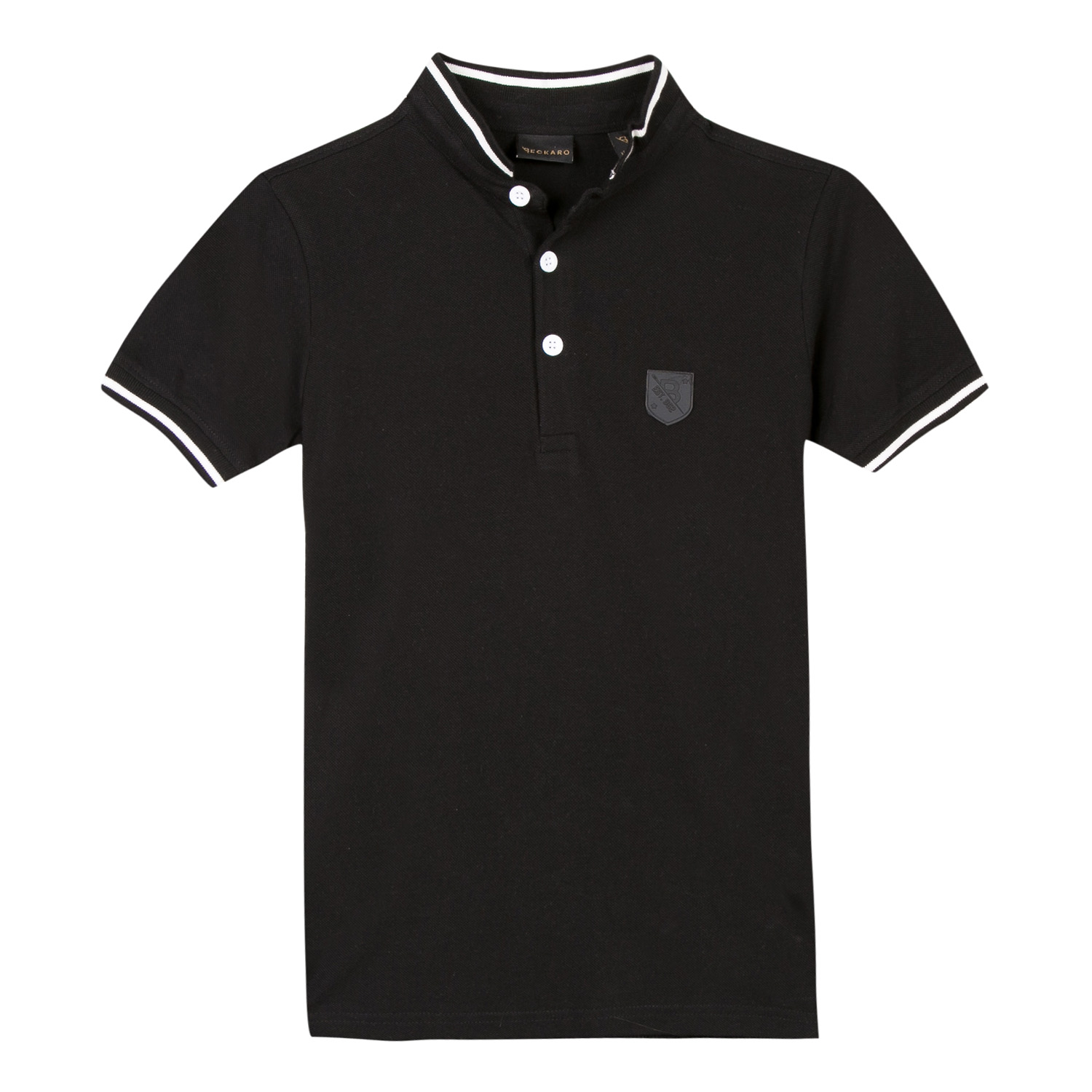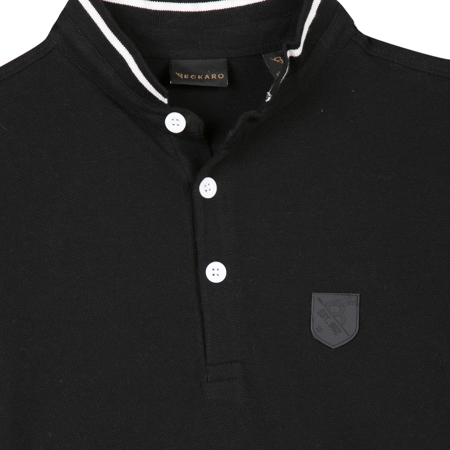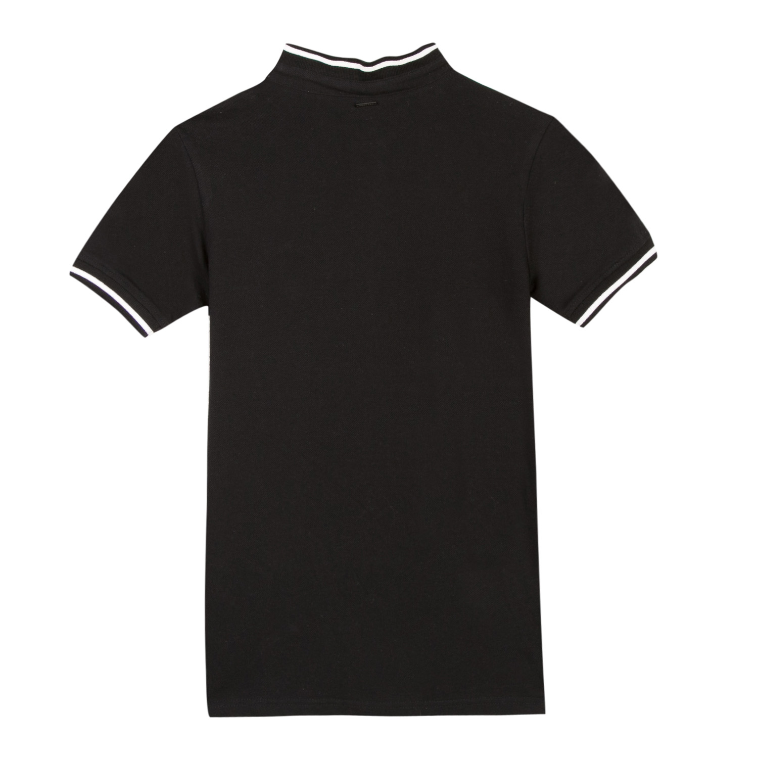 Polo preto masculino com gola e mangas curtas, detalhes brancos.