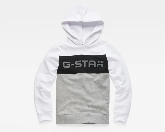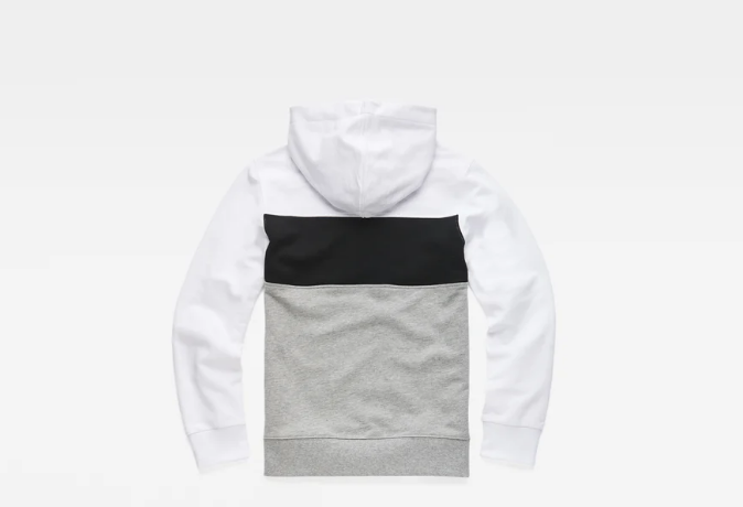 • Detalhes: Camisola com capuz tricolor. Branco, cinza e preto. Logotipo impresso da G-Star Raw na faixa central.