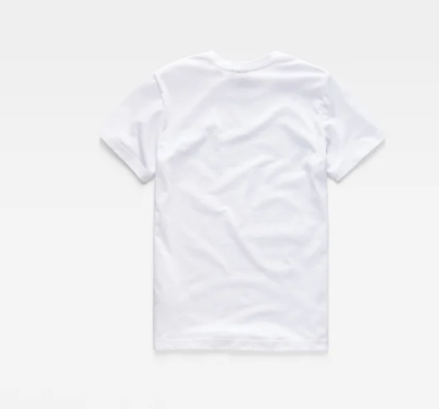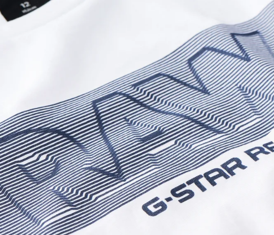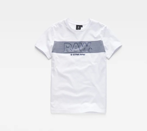 Camiseta branca G-STAR RAW com estampa azul cinzento e texto RAW. G-STAR RAW