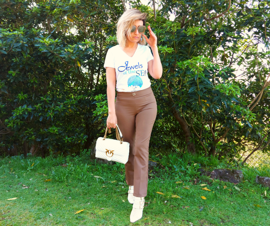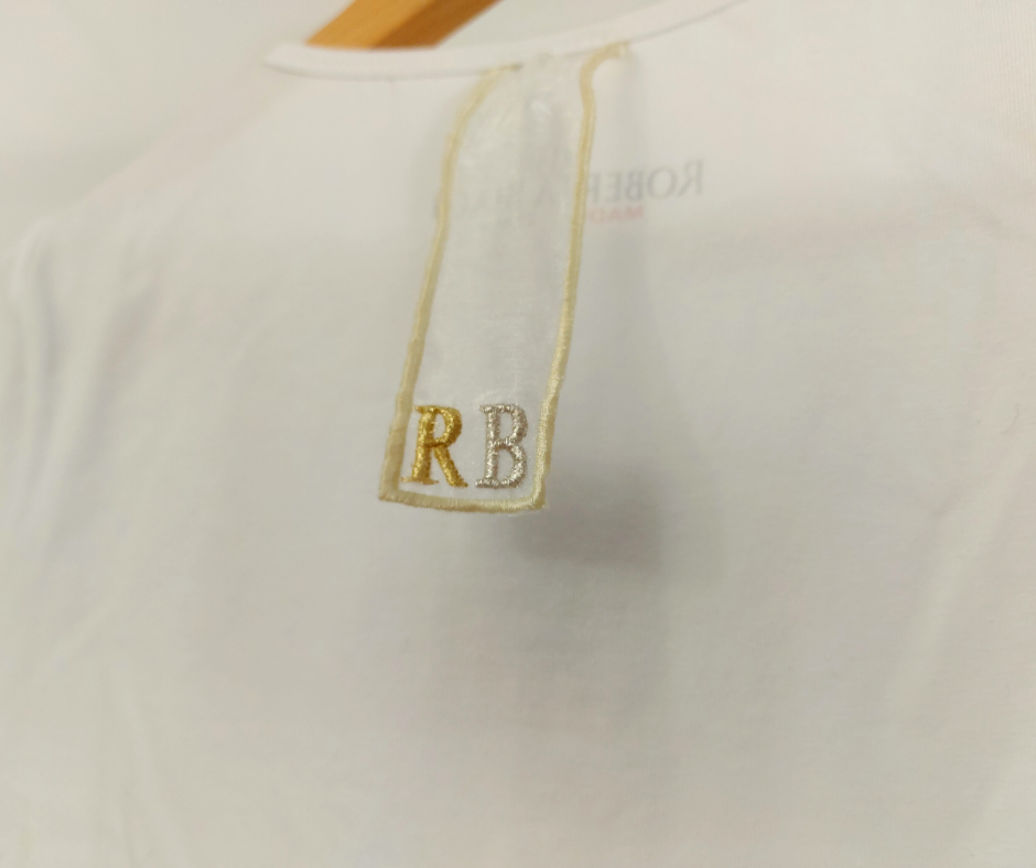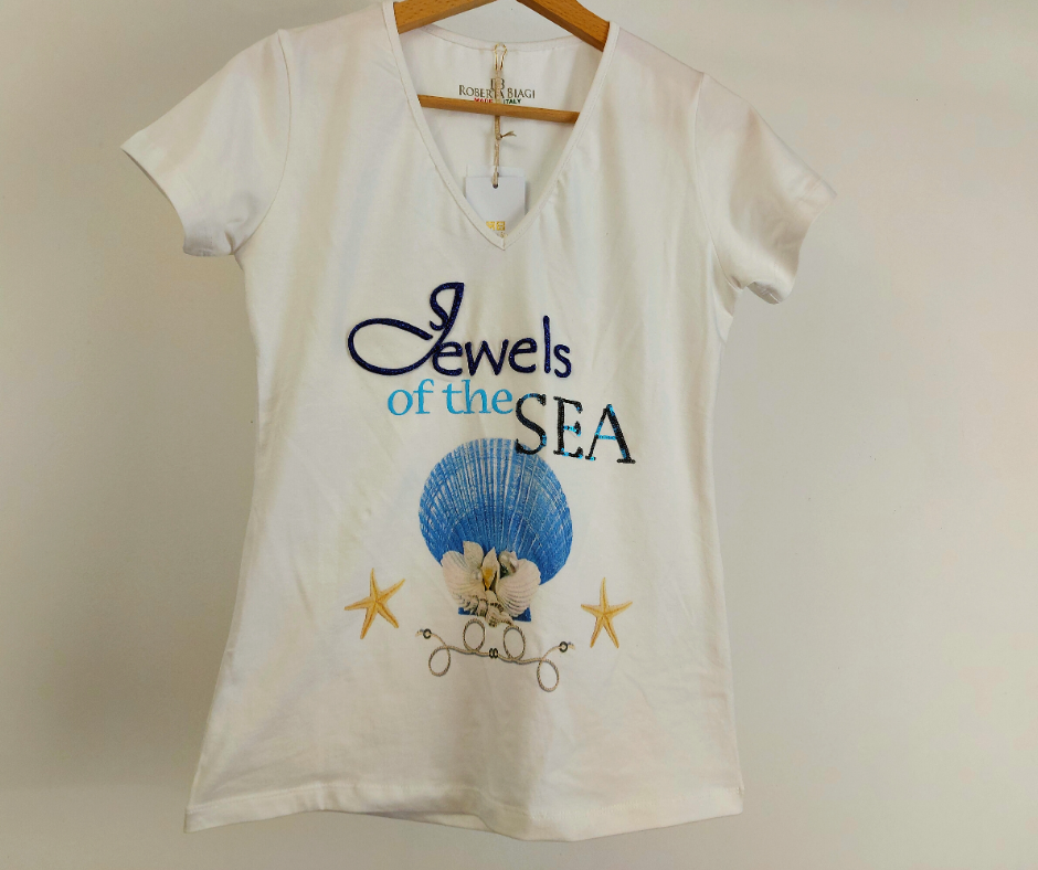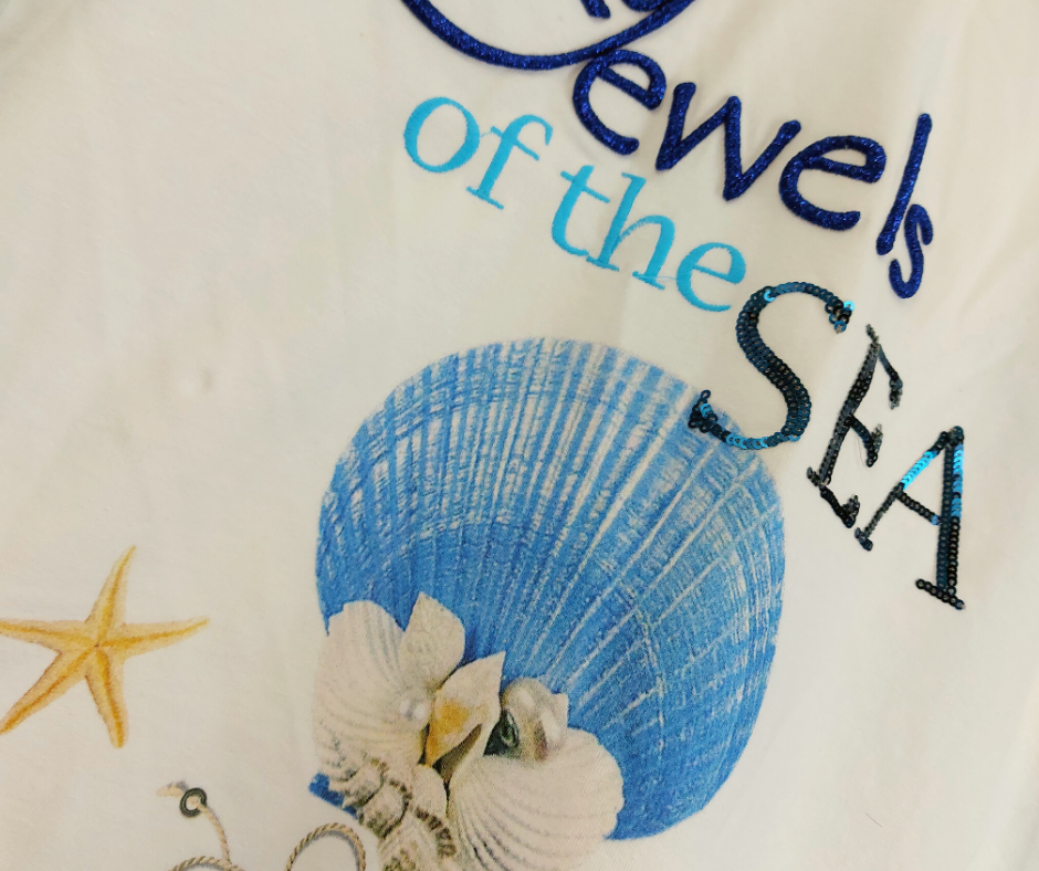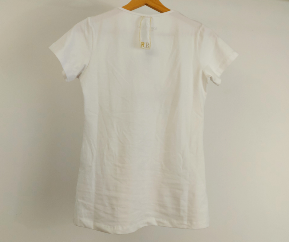 - Detalhes: T-shirt branca com estampado frontal. Detalhes em lantejoulas e frase em 3D.