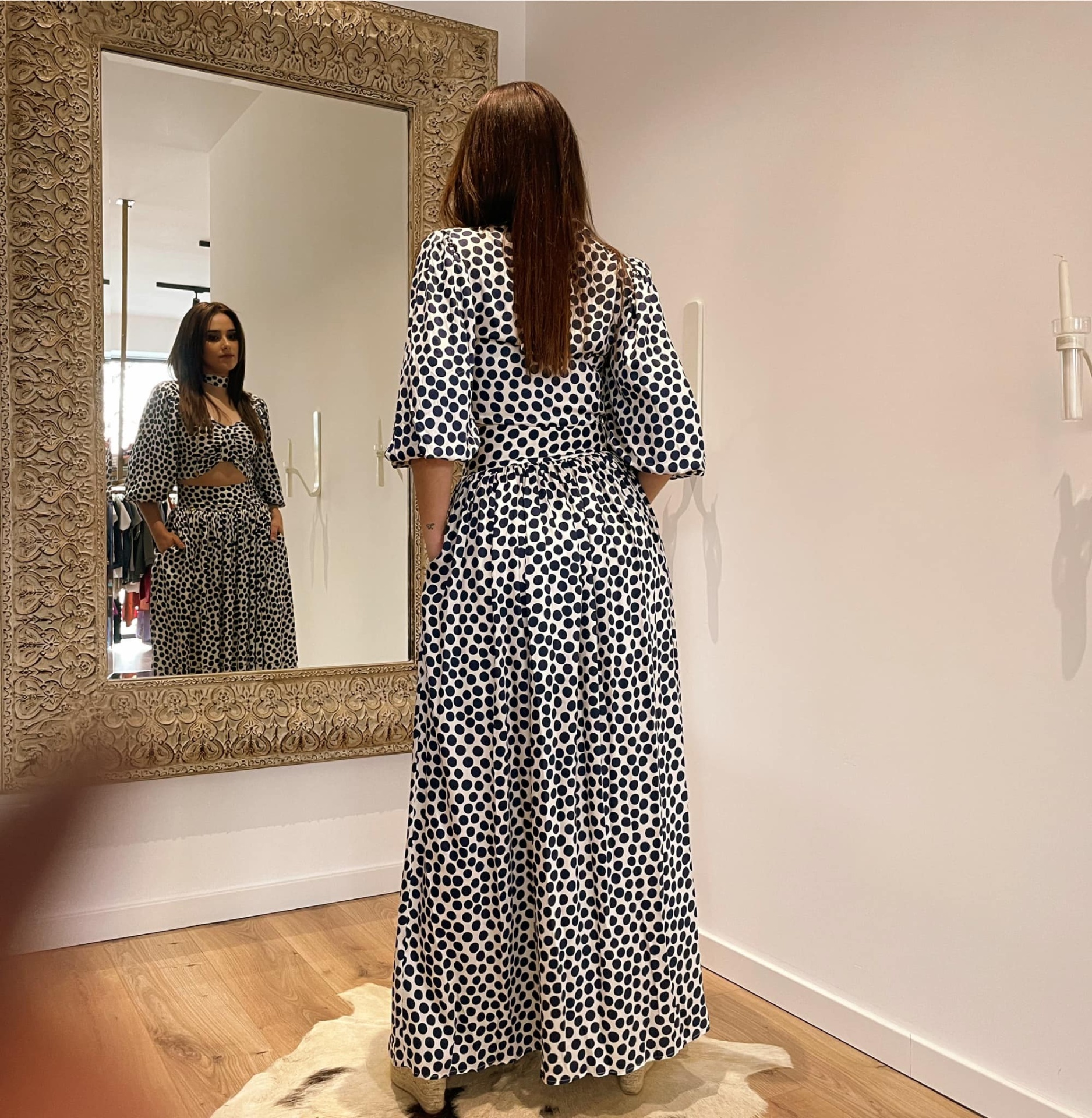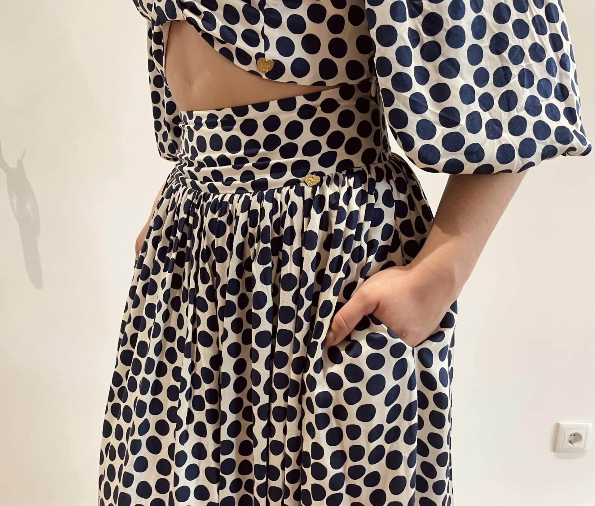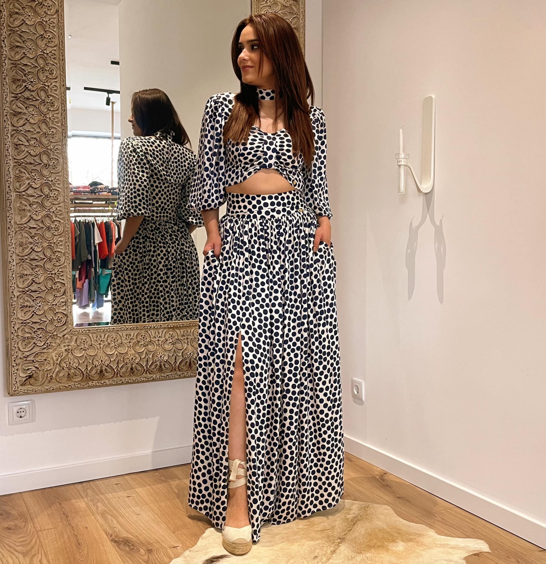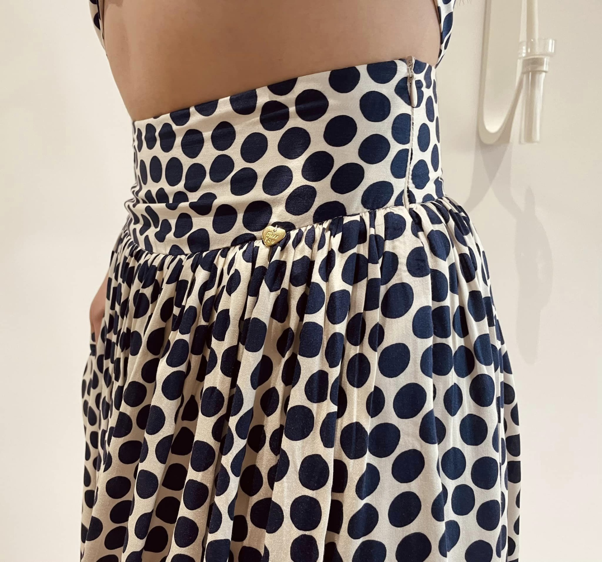 - Detalhes: Saia comprida com duas aberturas frontais. Cintura súbida. Padrão de bolas azuis.