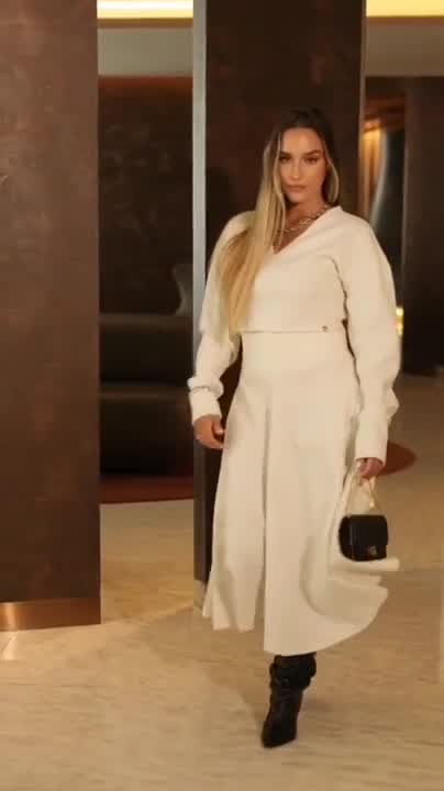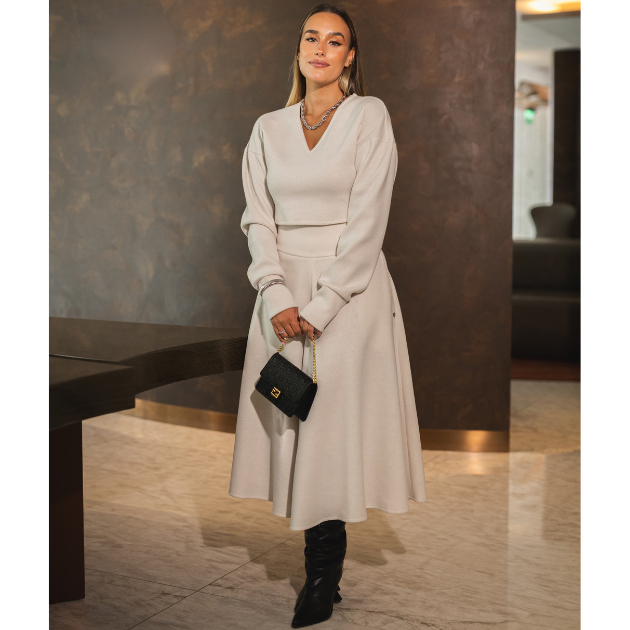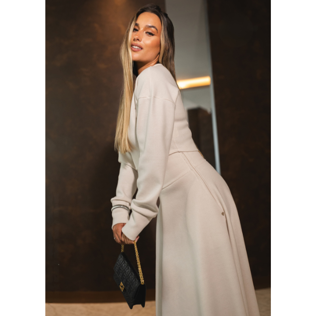 Confeccionadas num tecido suave e estruturado, ambas as peças apresentam um toque delicado e caimento impecável. O tom pérola transmite leveza e modernidade, tornando este conjunto perfeito tanto para ocasiões especiais como para momentos mais descontraídos.