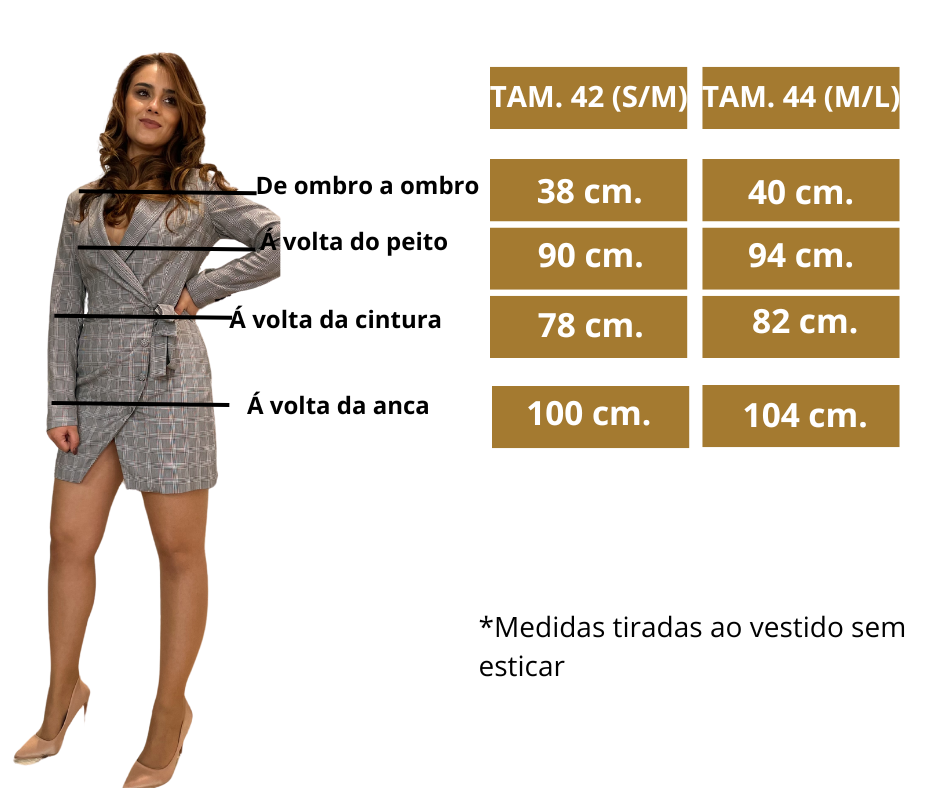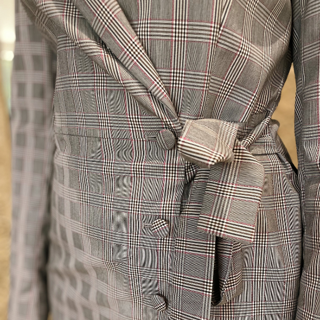 - Detalhes: Uma peça versátil que pode usar como vestido ou blazer. Padrão Príncipe de Gales com detalhes em rosa. Botões nos punhos e nó para laço, na cintura.