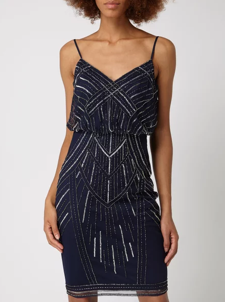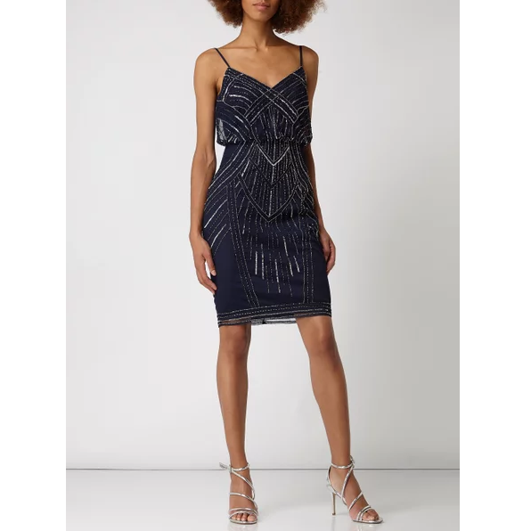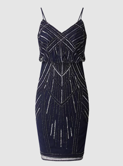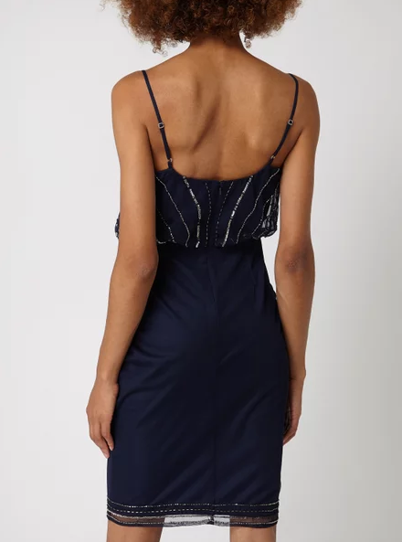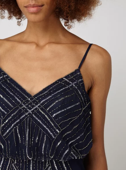 - Detalhes: Vestido azul marinho de missangas prateadas e pretas na parte da frente. Parte de trás lisa. Alças ajustáveis. Vestido devidamente forrado.