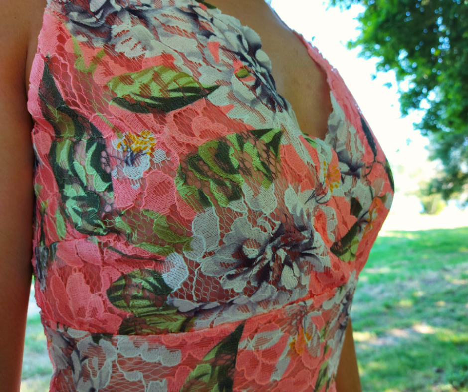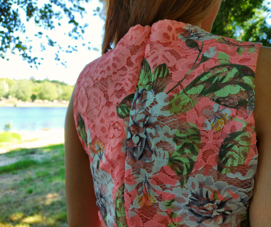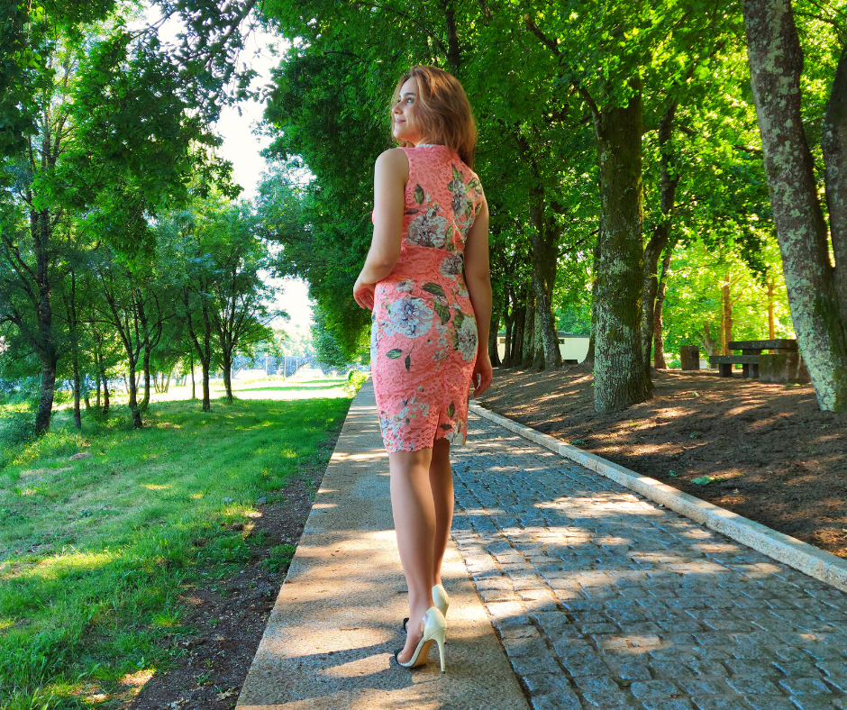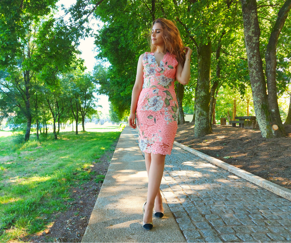 - Detalhes: Vestido de renda devidaemnte forrado. Modelo justo com pequena abertura na zona inferior, parte de trás. Padrão floral.