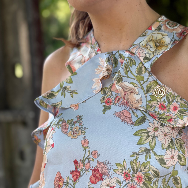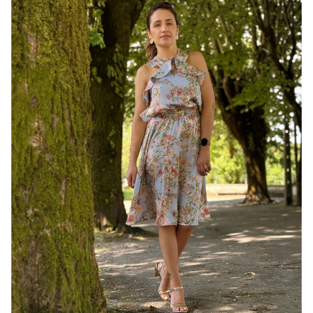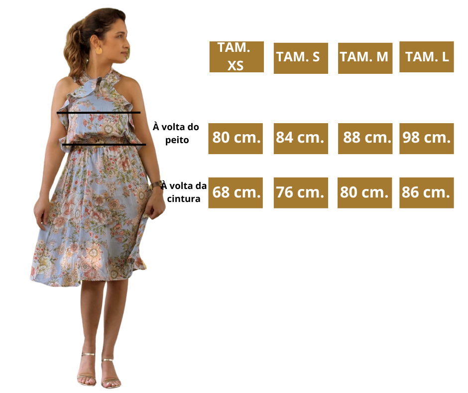 - Detalhes: Vestido azul com padrão florido, colorido. Costas cruzadas. Detalhe de folho. Cintura elástica. Medalha dourada, frontal, com logo RB.