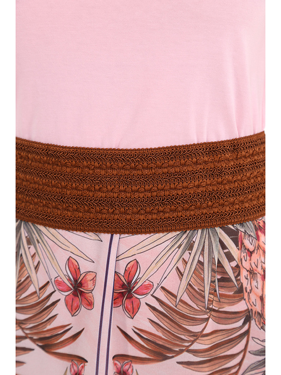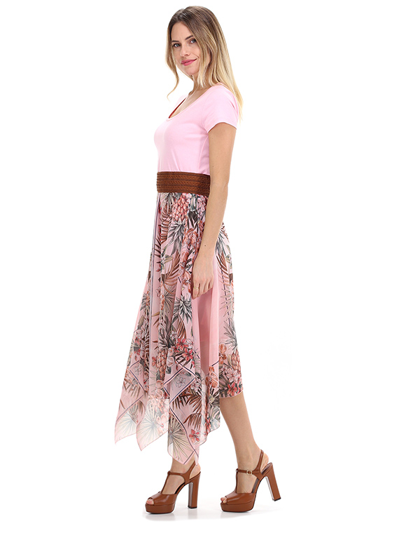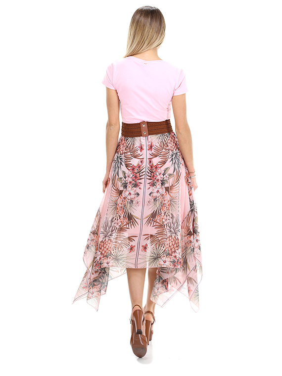 - Detalhes: Vestido com parte de cima em rosa, estilo t-shirt. Parte de baixo com padrão multicolorido, assimétrico.
