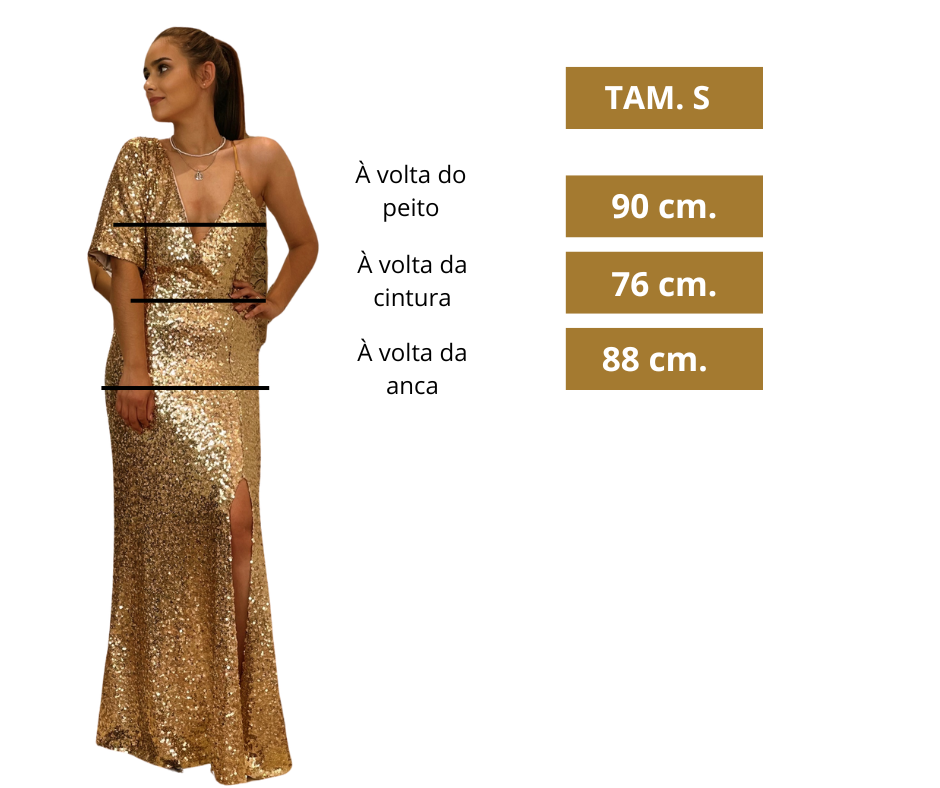 - Detalhes: Vestido comprido com racha frontal. Uma manga é manga curta a outra é de alça.
