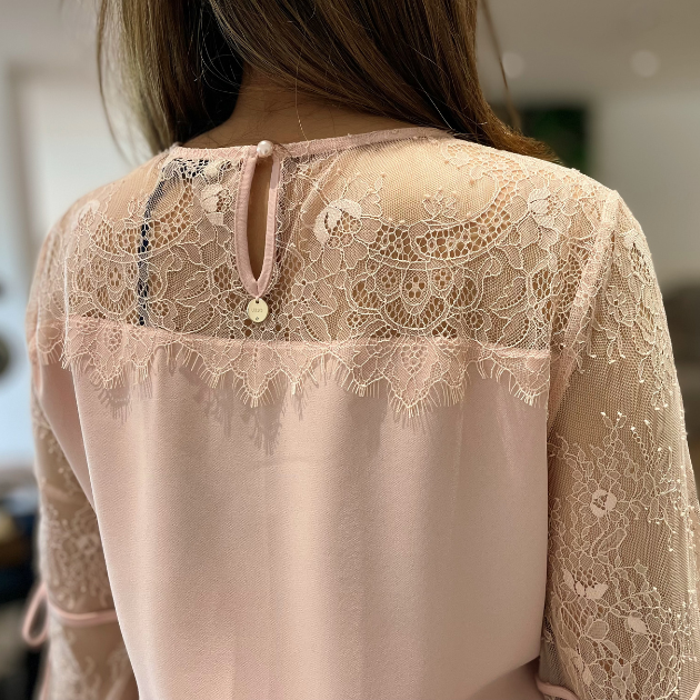 - Detalhes: Vestido fluído, corte reto. Mangas e peito em renda. Mangas de elástico. Cinto preto amovível.