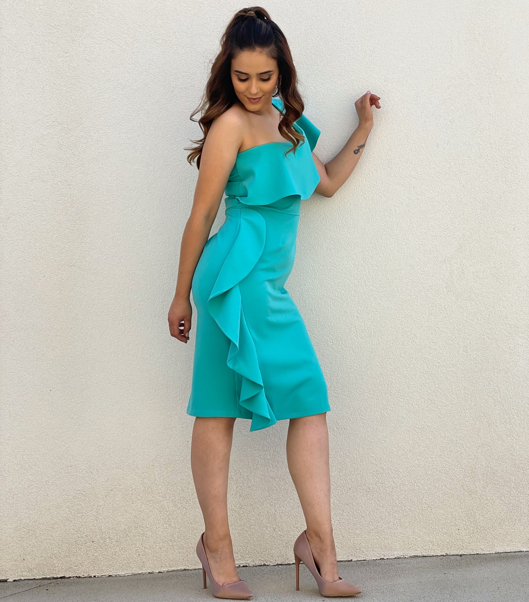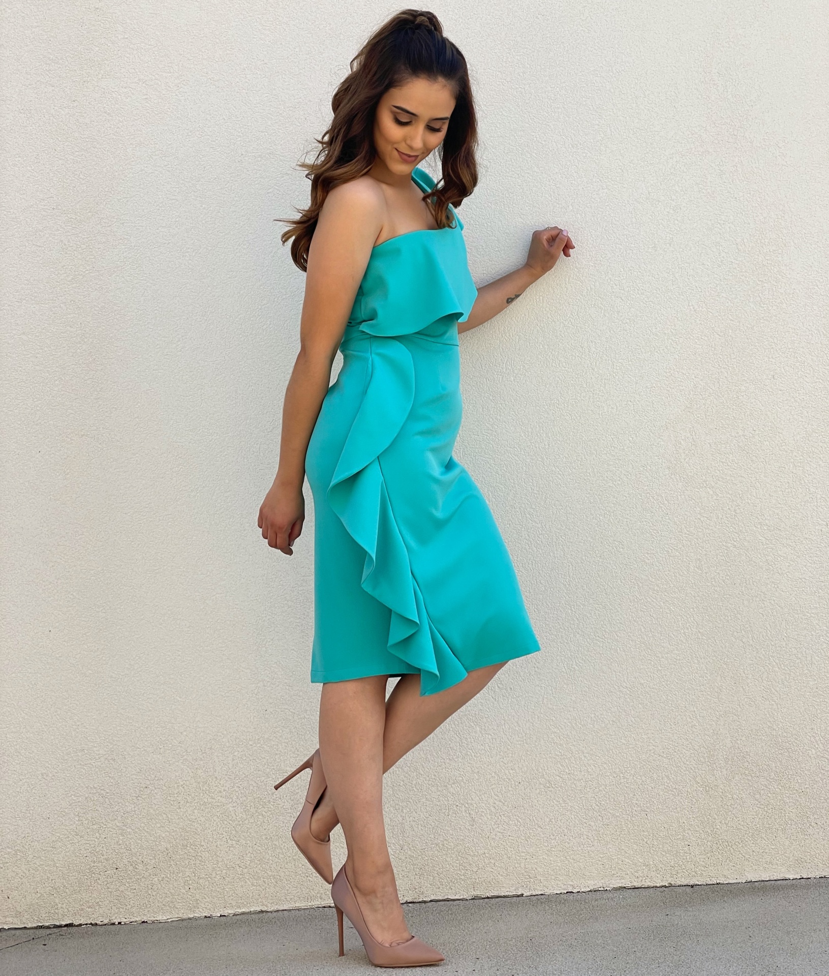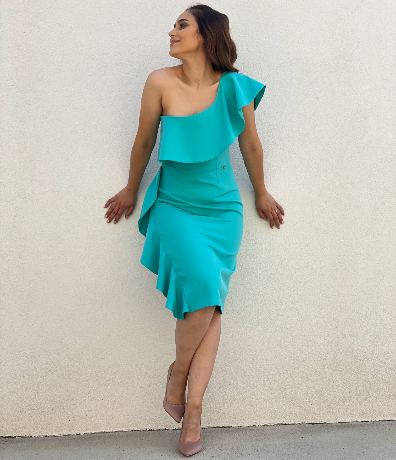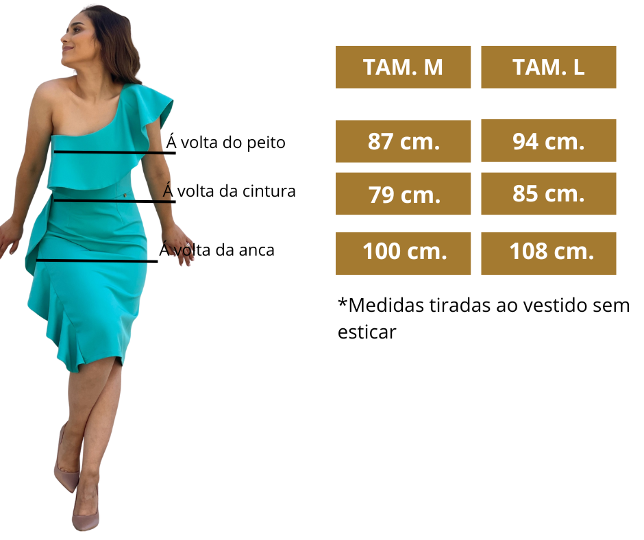 - Detalhes: Vestido com folho no ombro e na lateral. Racha na parte de trás.