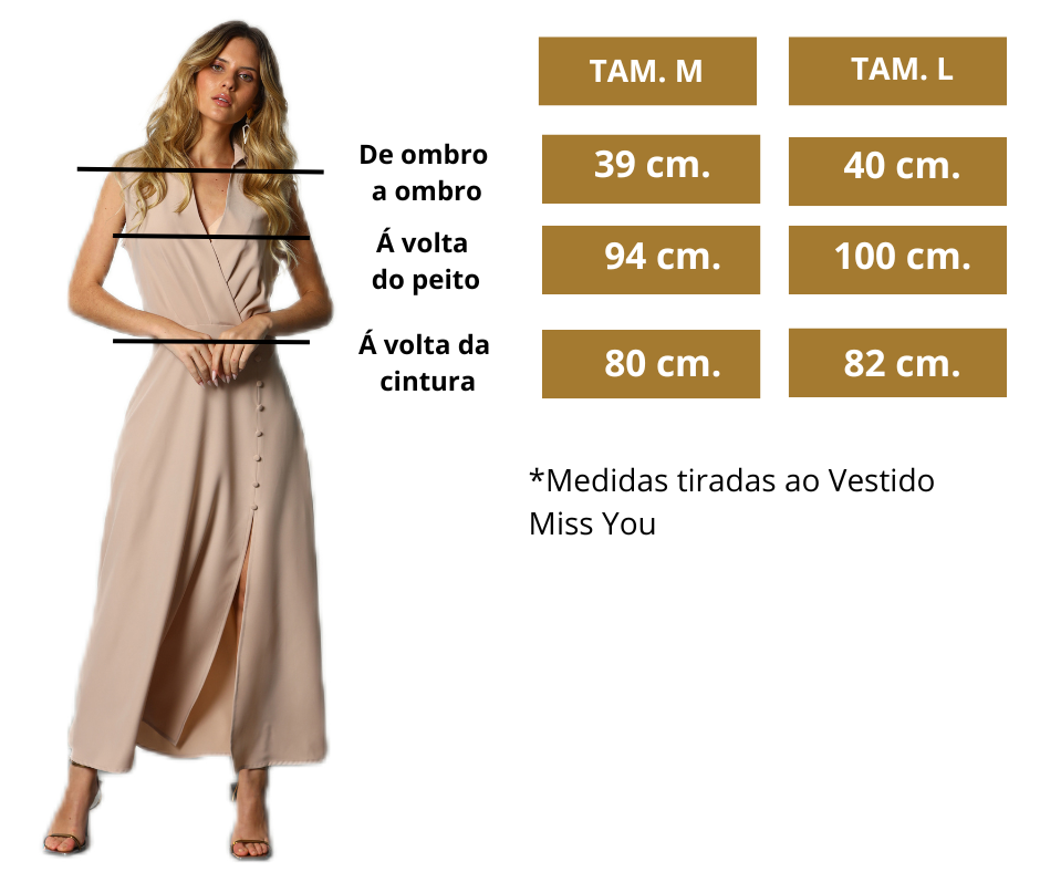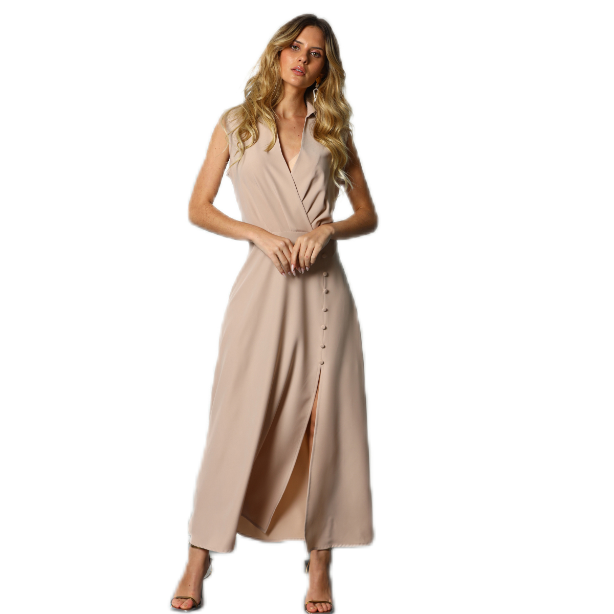 - Detalhes: Vestido midi bege. Manga cava. Decote em tréspasse. Detalhe de botões na saia e abertura.